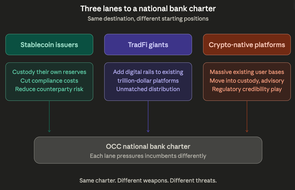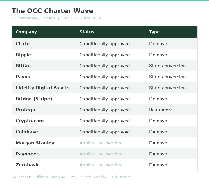 The CLARITY Act markup in the Senate Banking Committee, expected in late April, will add another layer. The OCC charters and the legislative framework are moving on parallel tracks, and the companies pursuing both simultaneously are the ones positioning for long-term advantage.