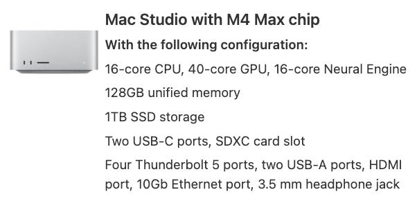 The configuration that checks both of those boxes is a Mac Studio M4 Max with 128 gigabytes of unified memory and a 40-core GPU.