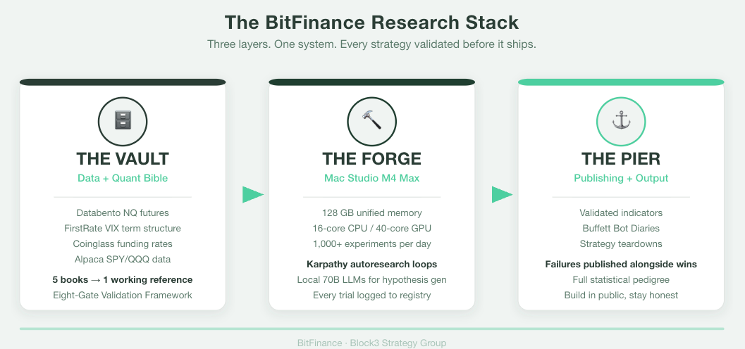The Vault is the foundation. It holds two things: the institutional-quality data we invested in (futures data, volatility data, crypto funding rates, equity pricing from Alpaca) and the Quant Bible that defines how we test ideas without fooling ourselves. I wrote about the data investment a few weeks ago. It wasn’t cheap, and I made a public bet that the return on that investment would be substantial. The Vault is what keeps the whole system honest. Garbage data produces garbage results, and undisciplined testing produces results that look great until they touch real money.