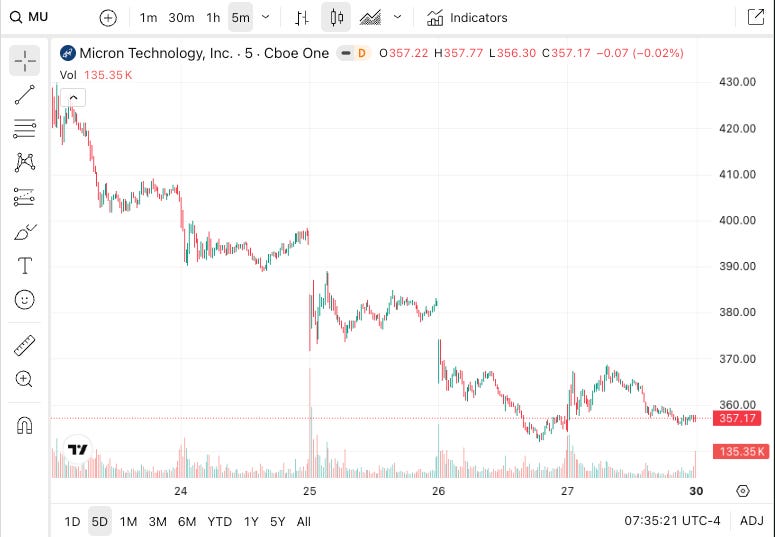 Micron Technology (MU). Down 22% in six sessions after reporting blowout earnings, then guiding to capex far above expectations. Alphabet’s TurboQuant AI compression algorithm announcement added pressure on memory names. BTIG noted this was Micron’s steepest post-high decline since 1999. When good earnings get sold, pay attention.