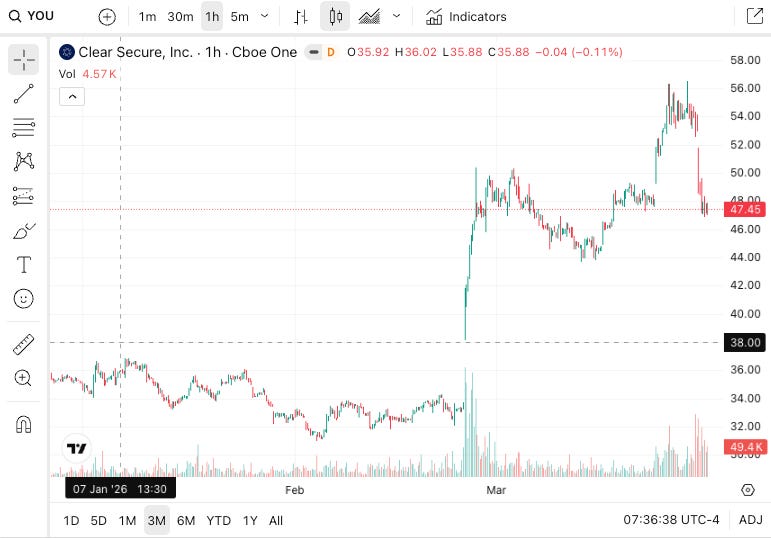 Clear Secure (YOU). Up 20%+ over two weeks as TSA lines lengthened during the partial government shutdown. App downloads tripled year-over-year in March. DA Davidson raised its price target to $65, citing the World Cup tailwind for air travel later this year. A textbook example of a company benefiting from someone else’s problem.