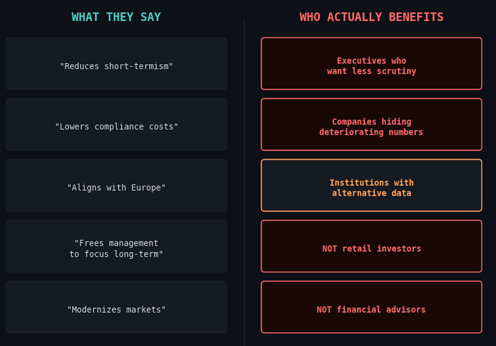 The beneficiaries are corporate executives who’d prefer less scrutiny and institutional investors who already have Bloomberg terminals, alternative data feeds, and real-time supply chain analytics. They don’t need 10-Qs. They have better data. Retail investors don’t. Reducing mandatory disclosure doesn’t level the playing field. It tilts it further toward the institutions and away from everyone else.