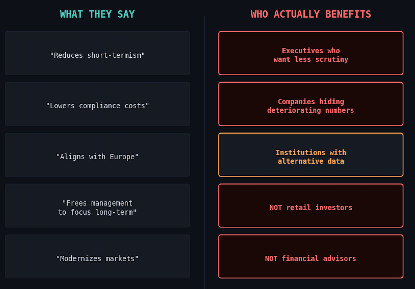 Retail investors don’t benefit. They lose half their windows into the companies they own. Financial advisors don’t benefit. Every RIA managing client portfolios relies on quarterly data to make allocation decisions and fulfill their fiduciary duty. Cut that in half and you increase the probability they miss something material.