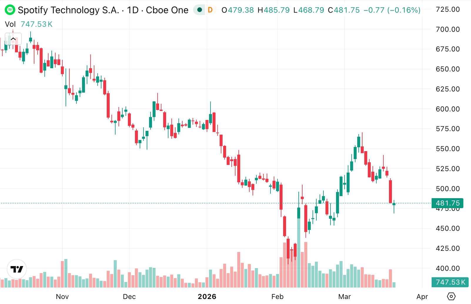 Spotify (SPOT). Down over 6% on the day as broader tech sold off. No company-specific catalyst, just a casualty of the risk-off rotation that’s hitting high-multiple growth names as the rate cut timeline extends further out. If you own high-duration growth stocks, the Fed’s one-cut projection is the headline that matters most to your portfolio.