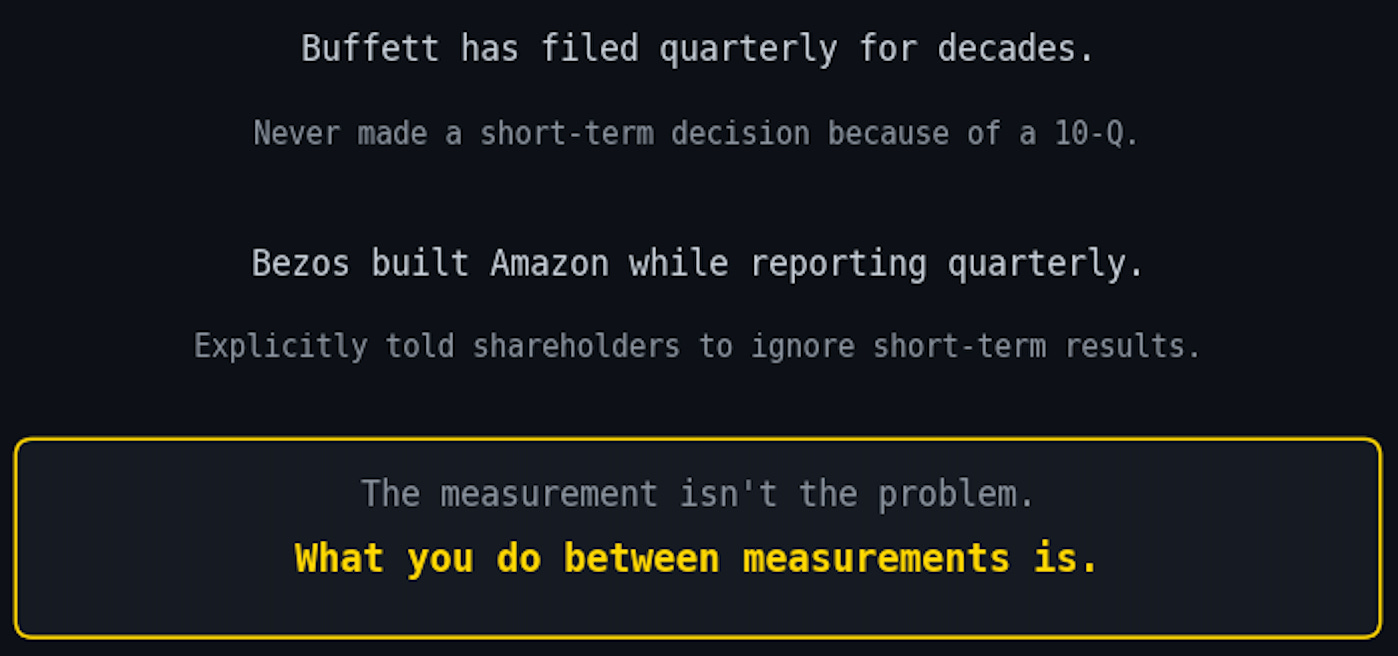 If a CEO is making bad decisions because they’re worried about the next quarter, that’s a leadership problem. A governance problem. A compensation structure problem. It is not a reporting frequency problem. Buffett has filed quarterly reports for Berkshire Hathaway for decades without once making a short-term decision because a 10-Q was due. Bezos built Amazon while reporting quarterly and explicitly telling shareholders to ignore short-term results.