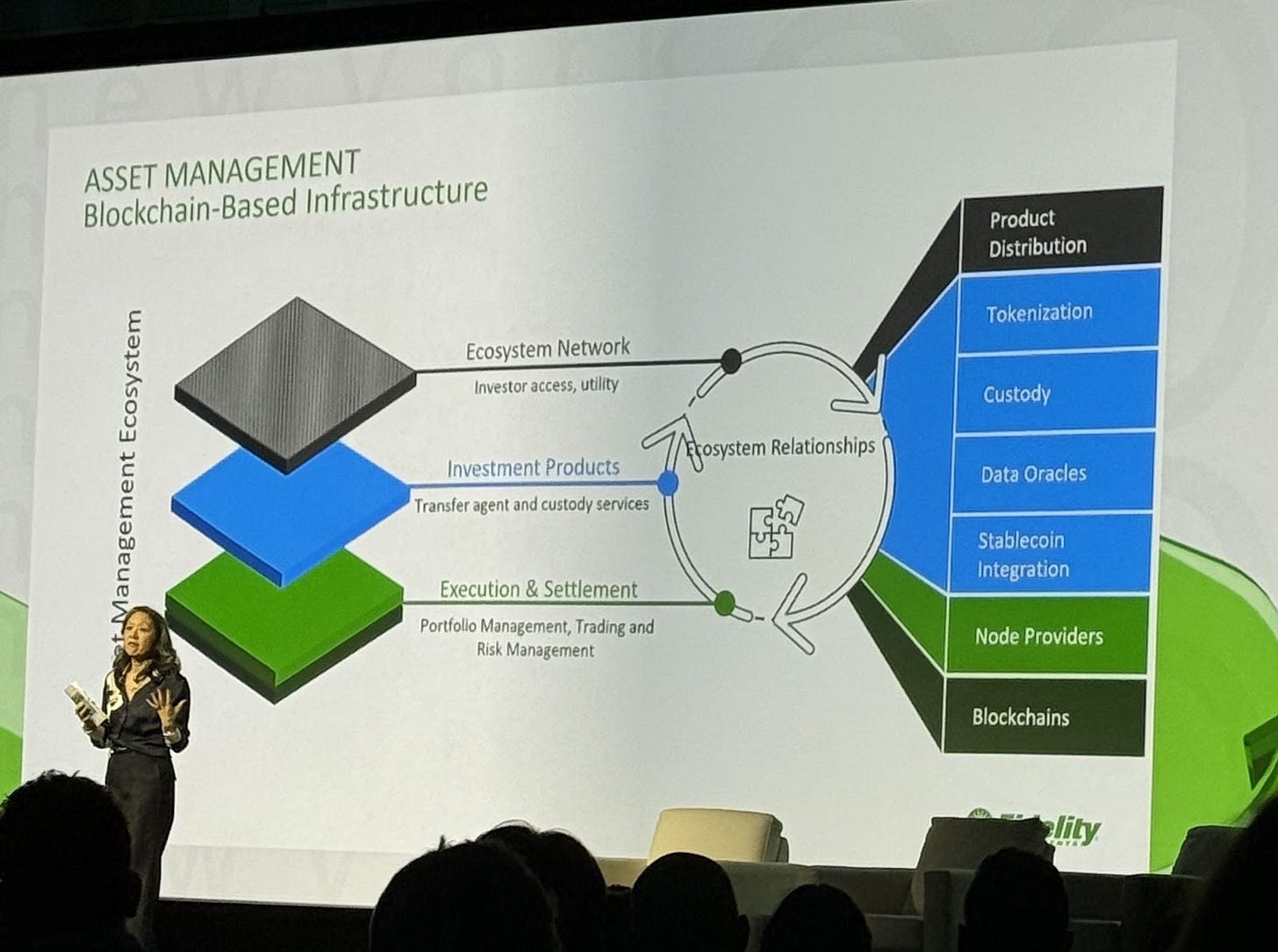 In one slide, they stacked out the full blockchain-based infrastructure layer: product distribution, tokenization, custody, data oracles, stablecoin integration, node providers, and the underlying blockchains themselves.