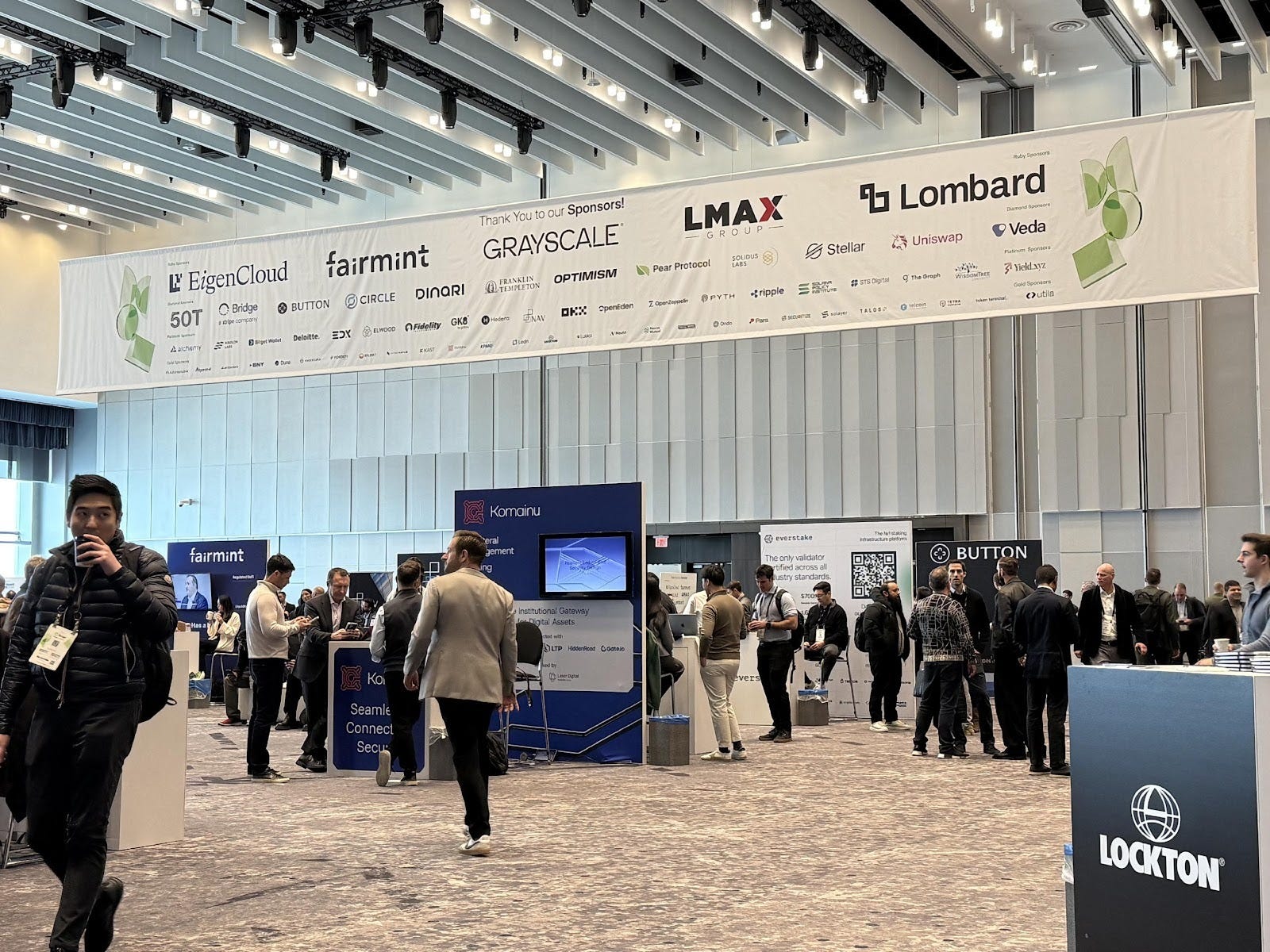 The exhibit floor had protocol logos on sponsor banners, but the conversations happening in front of those banners were about infrastructure, not tokens.