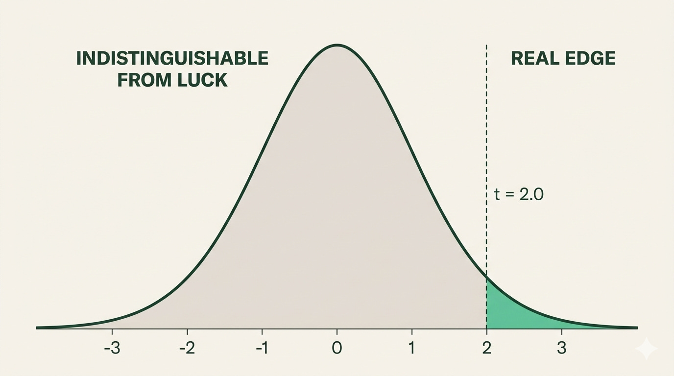 The t-stat measures how far a strategy’s returns are from what you’d expect from pure luck. A bigger number means we can be more confident the edge is real. A smaller number means we can’t reliably distinguish the strategy from a coin flip run 209 times.
