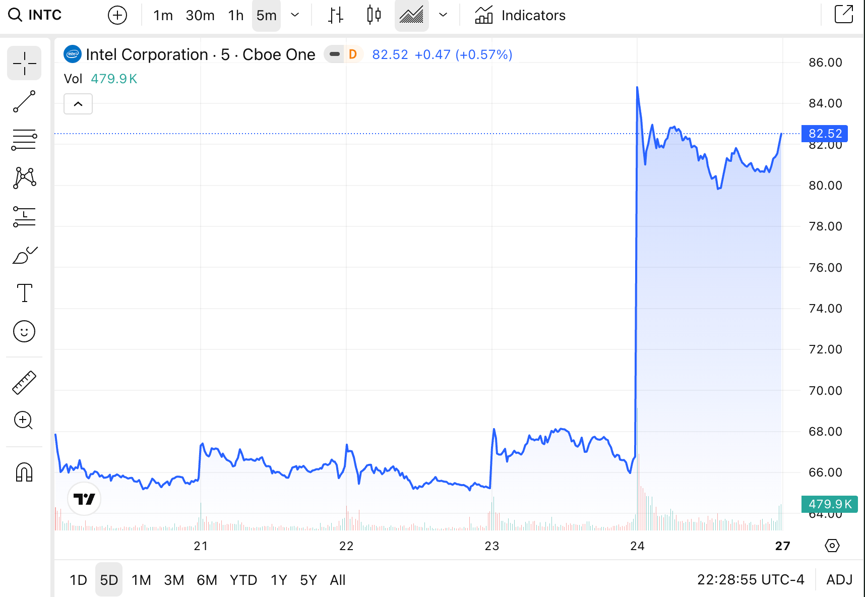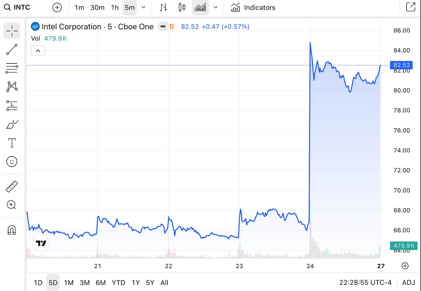 Intel (INTC). One word - YOWZA. Up 23.6% Friday on a blowout Q1 report, the chipmaker’s best single day since the dot-com era. AMD piggybacked for a 14% pop. Semiconductors closed higher for an 18th consecutive session.