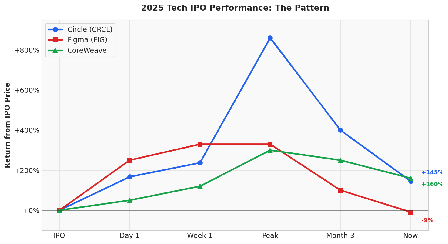 The design software company IPO’d in July 2025 at $33 per share. First day trading? The stock exploded 250% to $115. Retail investors piled in. Social media lit up with celebration posts. Figma hit a peak of $142, giving it a valuation that made Adobe’s failed $20 billion acquisition attempt look like a bargain.