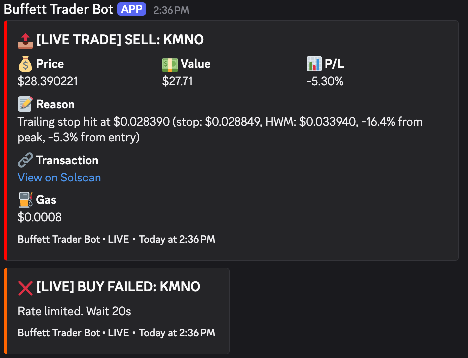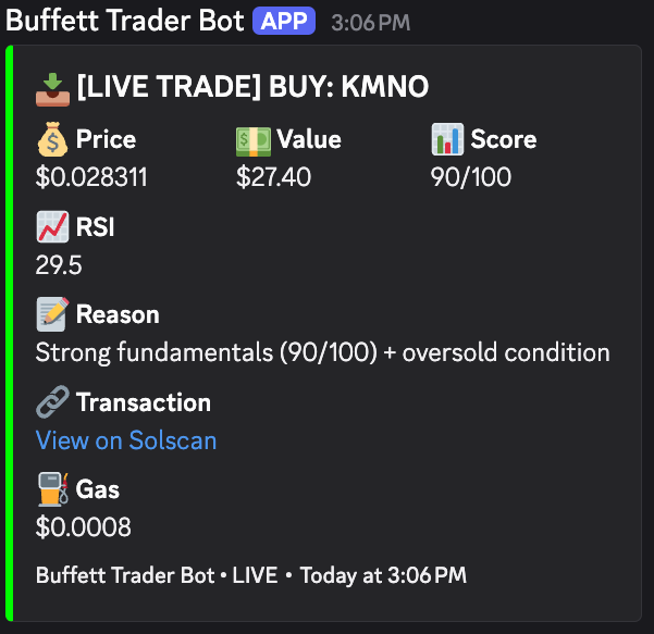 Wednesday night I got a Discord alert that the bot had sold KMNO (Kamino), a DeFi lending protocol it had purchased days earlier with a fundamental score of 90 out of 100.