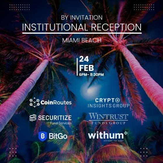 And on a personal note: I will be on the ground in Miami Beach on February 24 for an institutional reception organized by CoinRoutes, Securitize Fund Services, BitGo, Crypto Insights Group, Wintrust Funds Group, and Withum. The room represents a meaningful cross-section of custody, fund services, and institutional infrastructure. Exactly the kind of conversation worth having in person. If you will be there, reach out.