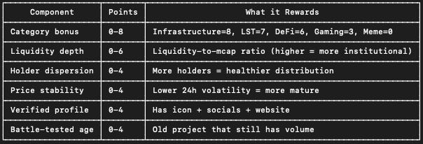 The bot now classifies every token into categories: infrastructure, DeFi, liquid staking, gaming, and meme. It scores project quality on a 0 to 30 point scale that rewards deep liquidity, holder dispersion, price stability, verified profiles, and battle-tested age. Infrastructure and DeFi protocols can score 25 to 30 bonus points. Meme coins score 0 to 5.