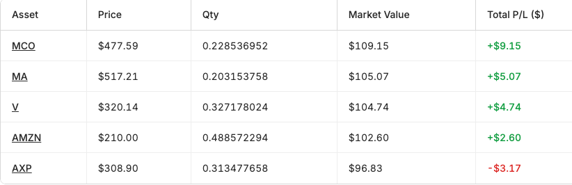 After a few days live, we are sitting at roughly 6% in the green across five open positions (none of which were chosen by me). I want to be careful about reading too much into a few days of paper trading results. That is not the point of this phase. The point is to observe the bot making decisions in real market conditions and understand where the logic holds and where it needs adjustment.