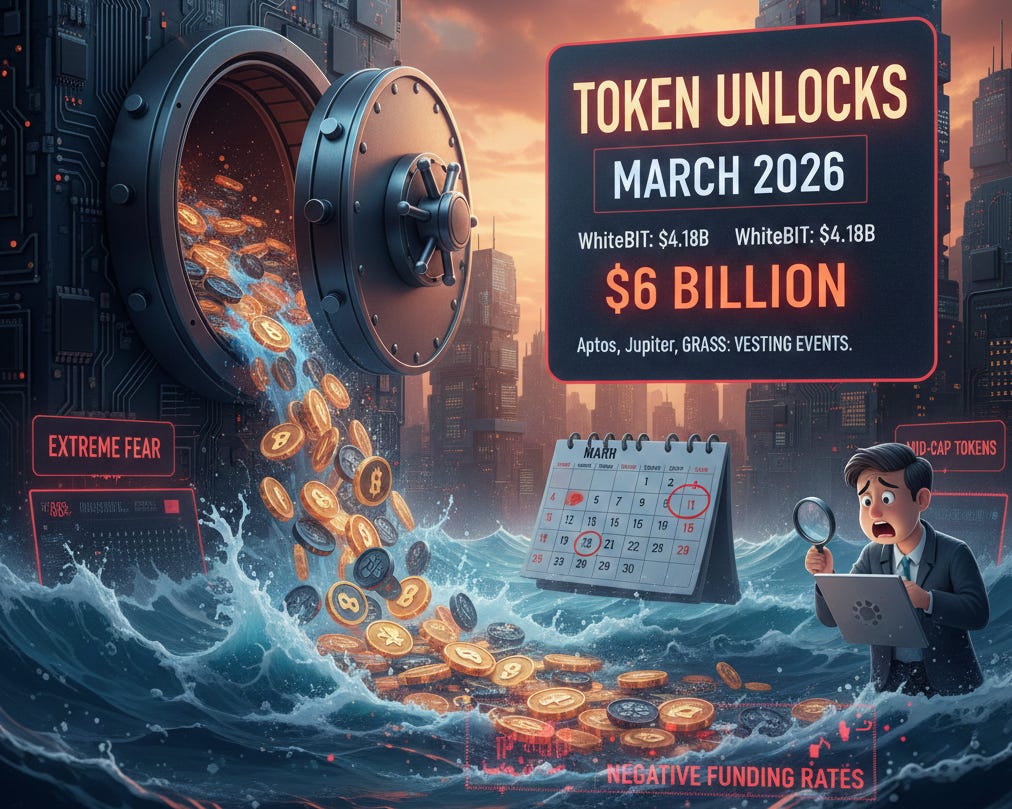 March token unlocks: $6 billion incoming. March is projected to be the largest monthly token unlock of 2026, roughly three times the typical average. WhiteBIT alone accounts for $4.18 billion, with Aptos, Jupiter, and GRASS adding significant vesting events in the first two weeks. In a market already running negative funding rates and sitting in "Extreme Fear," that is not a footnote. If you hold mid-cap tokens, check the vesting calendar before March catches you off guard.