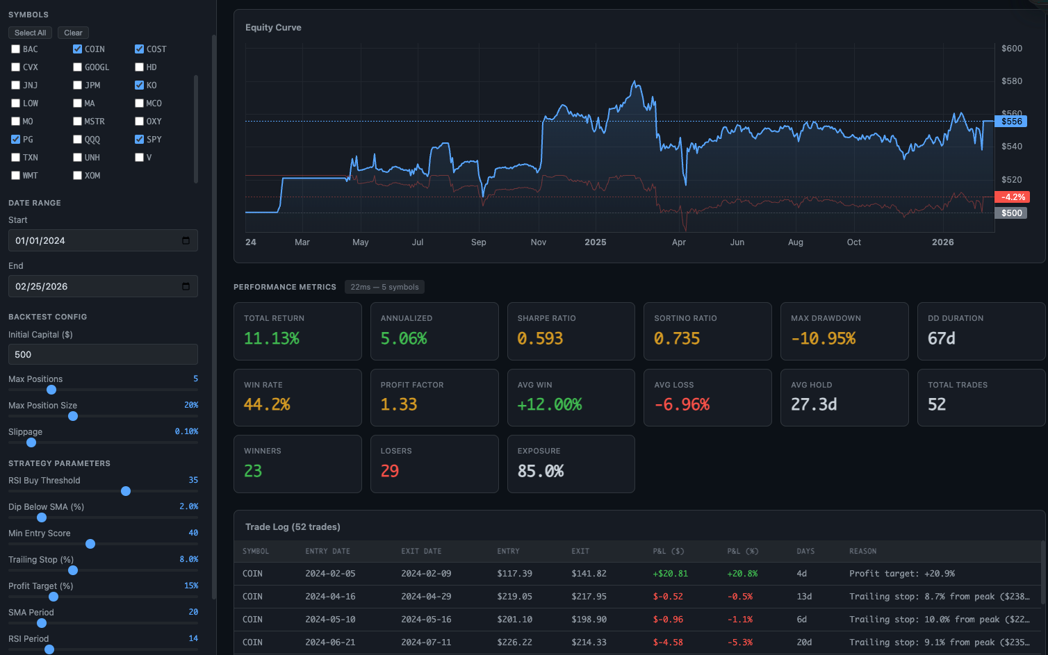 The part I find most useful is the sliders: you can adjust the profit-take threshold, the max drawdown tolerance, and other core parameters in real time and immediately see how that change would have affected the two-year simulated return.