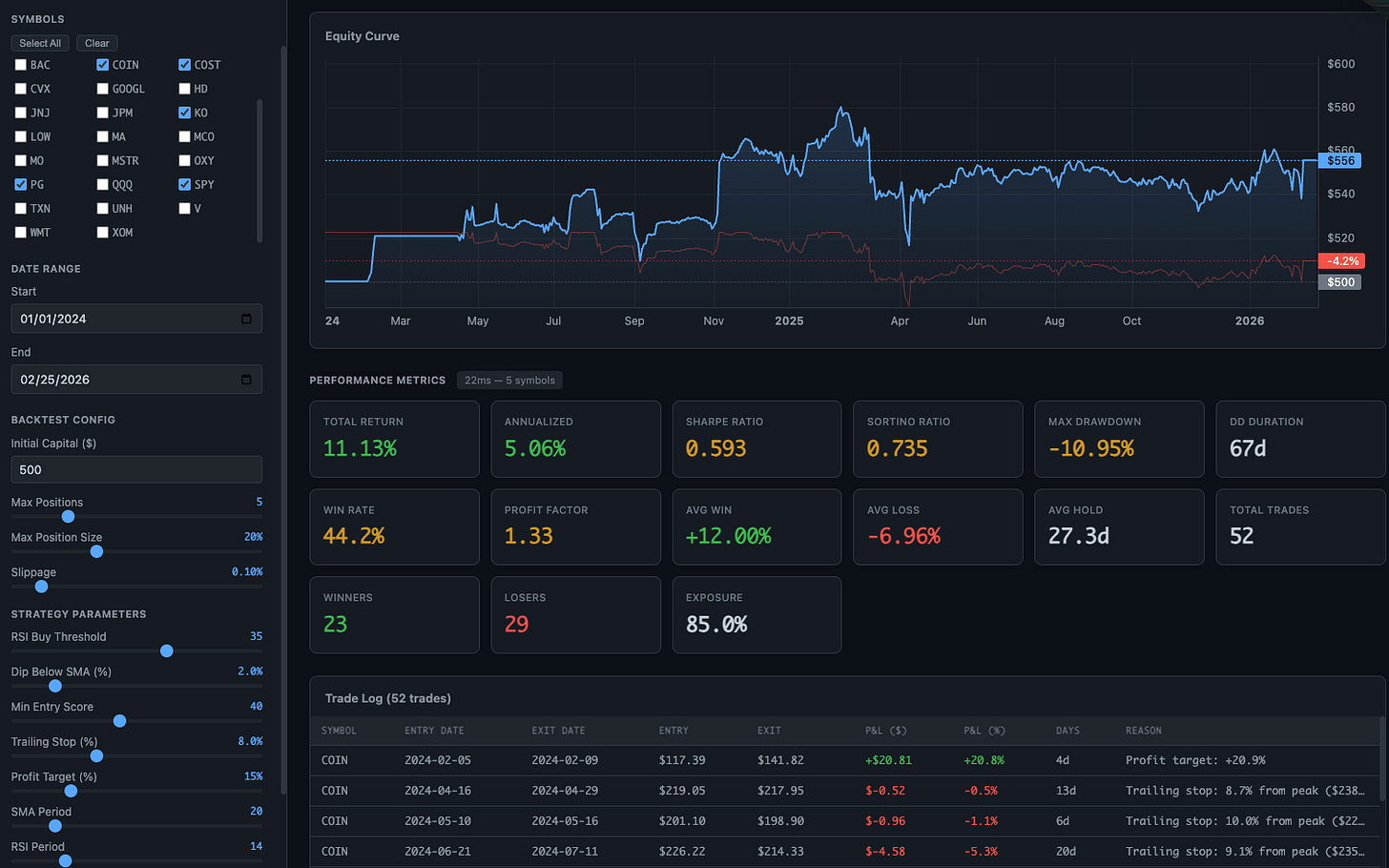 Running backtests manually every time you want to try something is slow. So the next step was asking Claude Code to turn it into an interactive dashboard.
