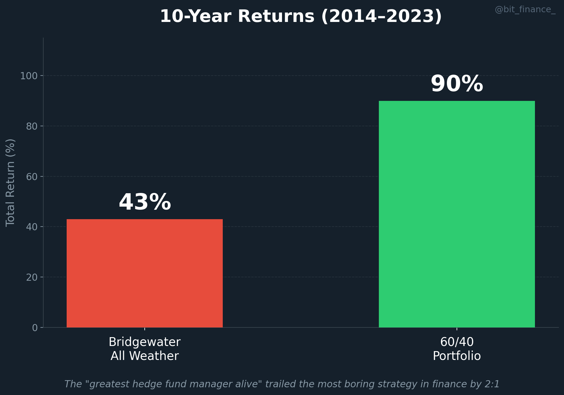 For the 10-year period from 2014 to 2023, Bridgewater’s All Weather fund returned 43%. During the same window, a standard 60/40 portfolio returned 90%.