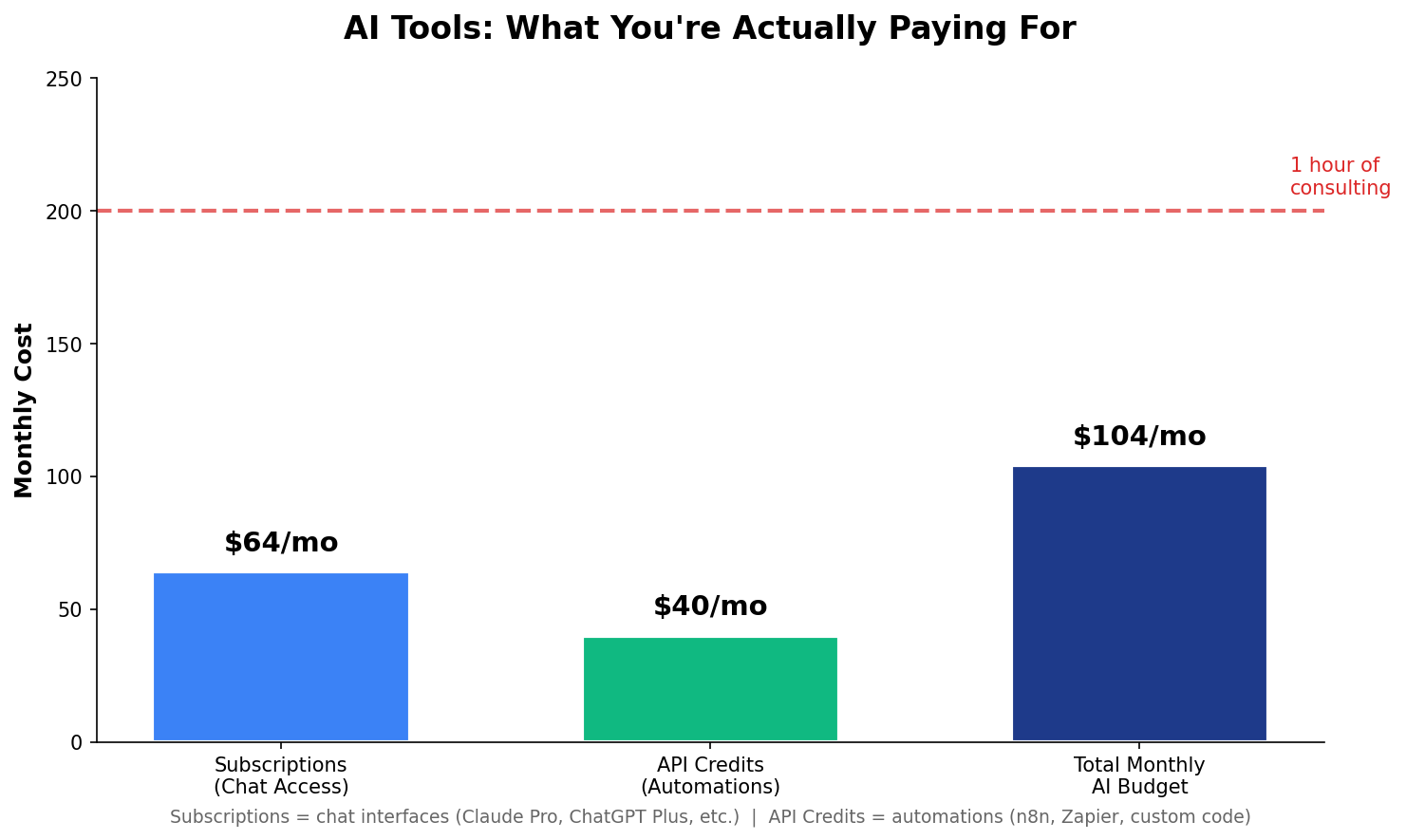 Compared to hiring a VA at $25-50/hour or a developer at $75-150/hour, it’s almost embarrassing. A full month of AI tools costs less than one hour of consulting.