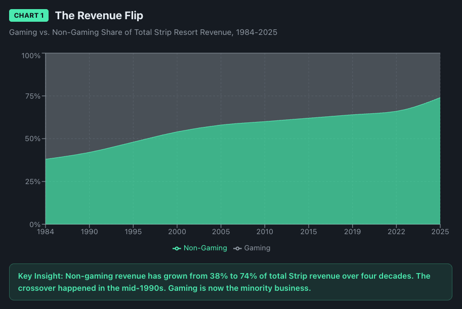 Gaming vs. Non-Gaming share of total Strip resort revenue, 1984 to 2025. Stacked area chart showing the crossover from gaming-majority to experience-majority revenue.