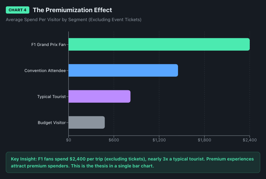 Average spend per visitor by segment. F1 fans at $2,400 vs. typical tourists at $820. The premium experience thesis in a single bar chart.
