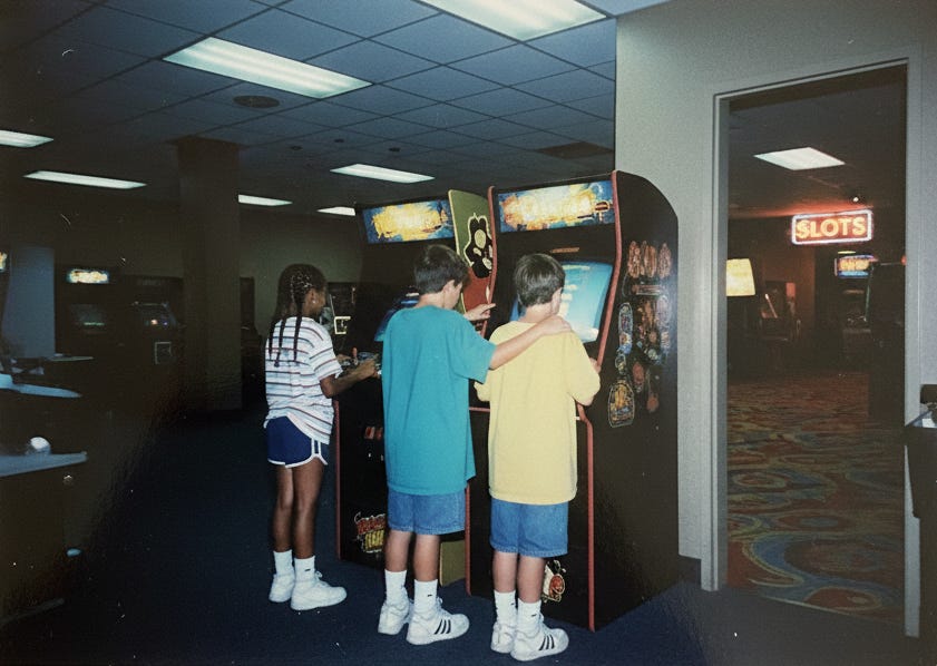 Every casino on the Strip had one back then. It was the unspoken deal: parents could hit the floor, and the kids got parked in a neon-lit room full of Time Crisis, Jurassic Park, and those claw machines that never quite closed all the way.