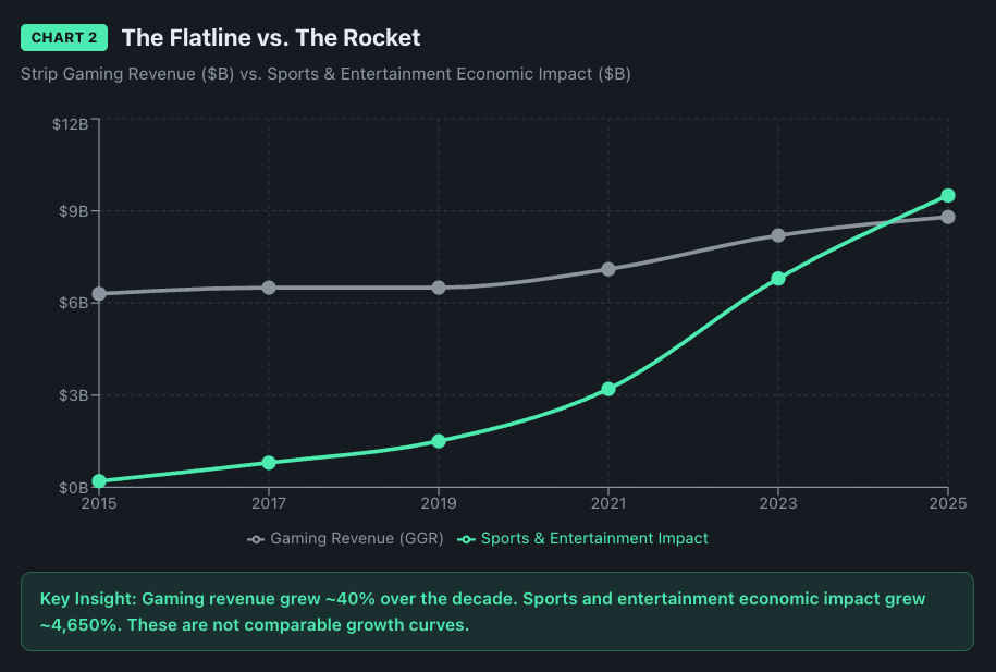 Strip Gaming Revenue vs. Sports and Entertainment economic impact, 2015 to 2025. Dual-line chart showing divergent trajectories.