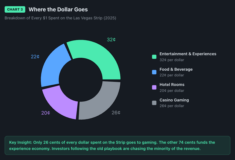 Meanwhile, non-gaming revenue (entertainment, food and beverage, hotel rooms) now accounts for roughly 74 cents of every dollar spent on the Strip. Gaming gets the other 26 cents.
